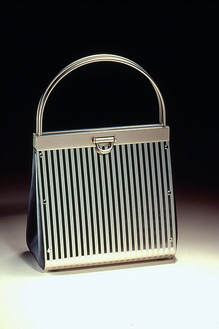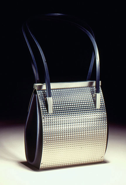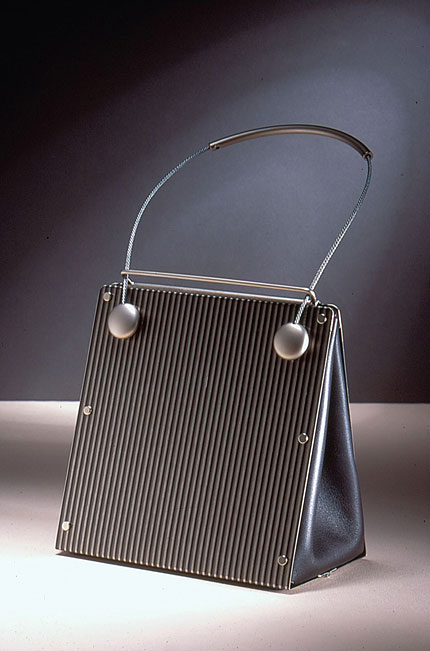The evolving collection of pieces by Wendy Stevens are hand-fabricated in stainless steel with leather components.