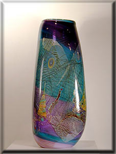 "The forms I have chosen to work with are used primarily as a support for brilliantly colored abstract paintings. These paintings are accomplished by combining a variety of glass elements, including color shards, cane, murrini, and frit, all of which are made ahead of time. The designs are arranged and preheated on a hot plate. The main body colors are usually transparent, applied in layers with opaque white sandwiched between interior and exterior colors, followed by several gathers of clear glass. When the final layer of glass is gathered, the piece is rolled over gold and silver leaf, followed by the preheated design. After working the design into the surface by reheating and shaping, the piece is blown out. Final shaping is done and the piece is placed in the annealer to cool.